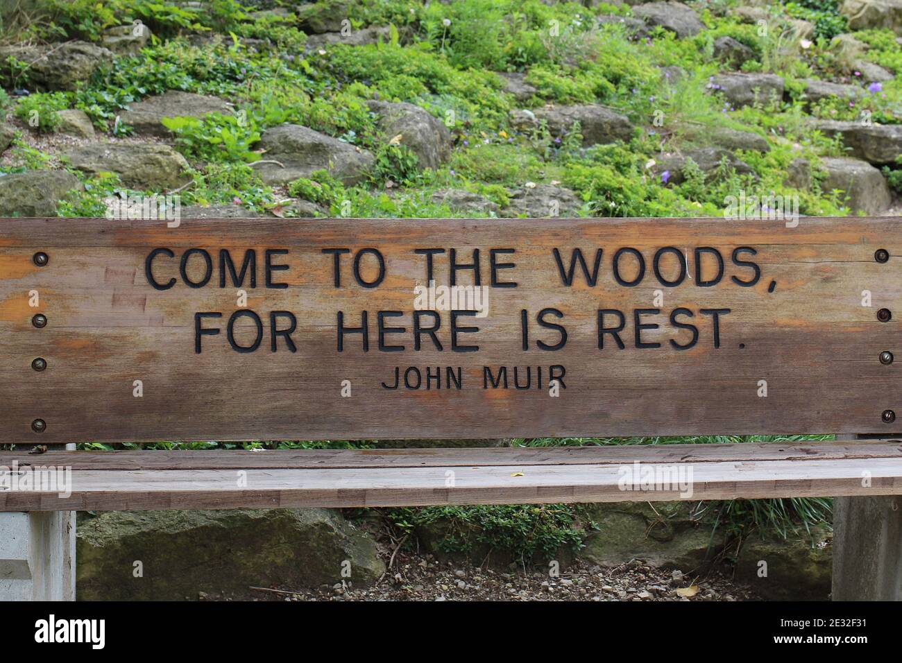 A wood park bench engraved with a quote from John Muir in front of